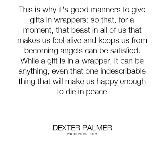 This is why it's good manners to give gifts in wrappers: so that, for a moment, that beast in all of us that makes us feel alive and keeps us from becoming angels can be satisfied. While a gift is in a wrapper, it can be anything, even that one indescribable thing that will make us happy enough to die in peace