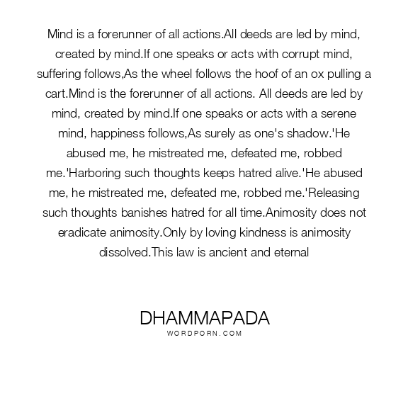 Mind is a forerunner of all actions.All deeds are led by mind, created by mind.If one speaks or acts with corrupt mind, suffering follows,As the wheel follows the hoof of an ox pulling a cart.Mind is the forerunner of all actions. All deeds are led by mind, created by mind.If one speaks or acts with a serene mind, happiness follows,As surely as one's shadow.'He abused me, he mistreated me, defeated me, robbed me.'Harboring such thoughts keeps hatred alive.'He abused me, he mistreated me, defeated me, robbed me.'Releasing such thoughts banishes hatred for all time.Animosity does not eradicate animosity.Only by loving kindness is animosity dissolved.This law is ancient and eternal