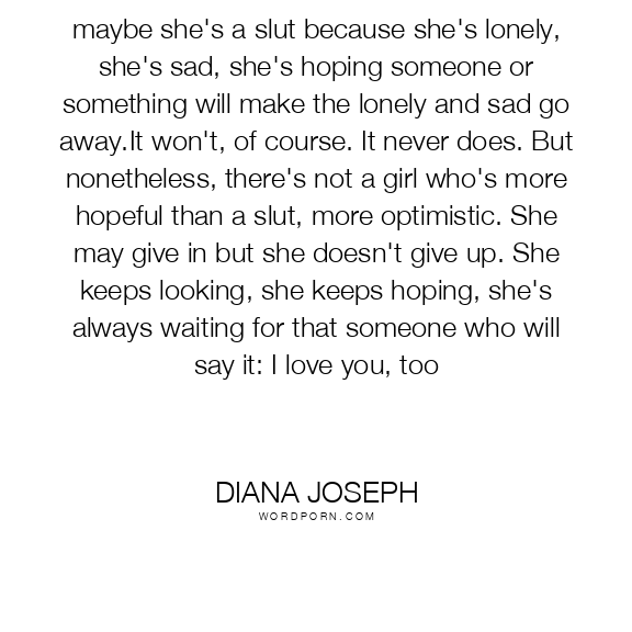 maybe she's a slut because she's lonely, she's sad, she's hoping someone or something will make the lonely and sad go away.It won't, of course. It never does. But nonetheless, there's not a girl who's more hopeful than a slut, more optimistic. She may give in but she doesn't give up. She keeps looking, she keeps hoping, she's always waiting for that someone who will say it: I love you, too