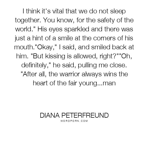 I think it's vital that we do not sleep together. You know, for the safety of the world." His eyes sparkled and there was just a hint of a smile at the corners of his mouth."Okay," I said, and smiled back at him. "But kissing is allowed, right?""Oh, definitely," he said, pulling me close. "After all, the warrior always wins the heart of the fair young...man
