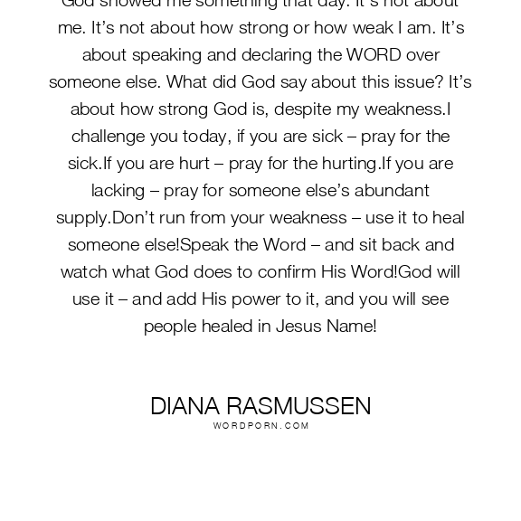 God showed me something that day. It’s not about me. It’s not about how strong or how weak I am. It’s about speaking and declaring the WORD over someone else. What did God say about this issue? It’s about how strong God is, despite my weakness.I challenge you today, if you are sick – pray for the sick.If you are hurt – pray for the hurting.If you are lacking – pray for someone else’s abundant supply.Don’t run from your weakness – use it to heal someone else!Speak the Word – and sit back and watch what God does to confirm His Word!God will use it – and add His power to it, and you will see people healed in Jesus Name!