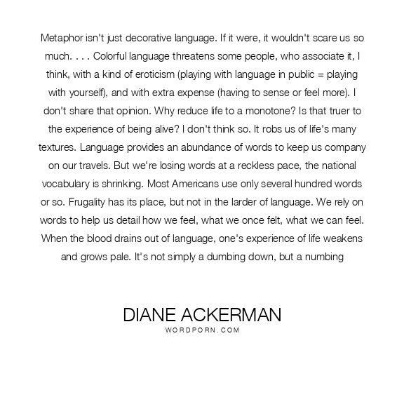 Diane Ackerman quote. Metaphor isn't just decorative language. If it were, it wouldn't scare us so much. . . . Colorful language threatens some people, who associate it, I think, with a kind of eroticism (playing with language in public = playing with yourself), and with extra expense (having to sense or feel more). I don't share that opinion. Why reduce life to a monotone? Is that truer to the experience of being alive? I don't think so. It robs us of life's many textures. Language provides an abundance of words to keep us company on our travels. But we're losing words at a reckless pace, the national vocabulary is shrinking. Most Americans use only several hundred words or so. Frugality has its place, but not in the larder of language. We rely on words to help us detail how we feel, what we once felt, what we can feel. When the blood drains out of language, one's experience of life weakens and grows pale. It's not simply a dumbing down, but a numbing