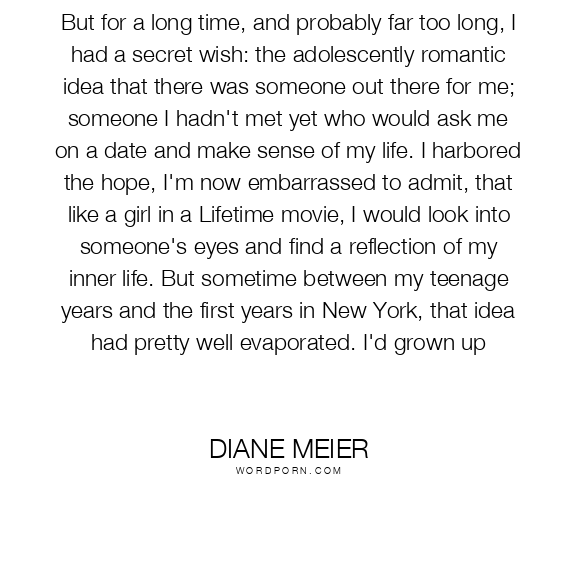 But for a long time, and probably far too long, I had a secret wish: the adolescently romantic idea that there was someone out there for me; someone I hadn't met yet who would ask me on a date and make sense of my life. I harbored the hope, I'm now embarrassed to admit, that like a girl in a Lifetime movie, I would look into someone's eyes and find a reflection of my inner life. But sometime between my teenage years and the first years in New York, that idea had pretty well evaporated. I'd grown up