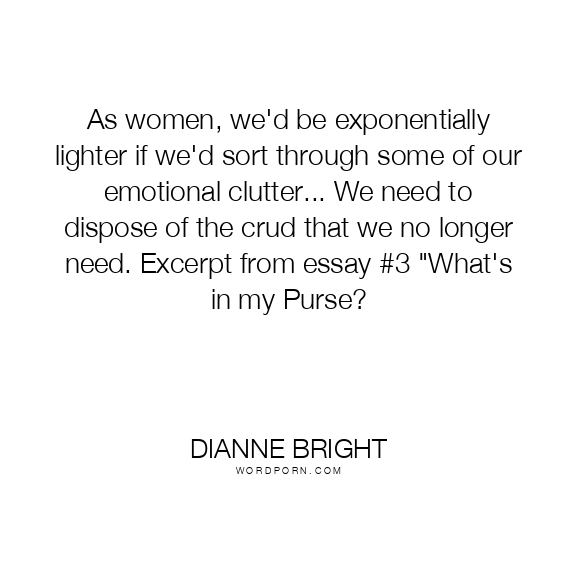 As women, we'd be exponentially lighter if we'd sort through some of our emotional clutter... We need to dispose of the crud that we no longer need. Excerpt from essay #3 "What's in my Purse?