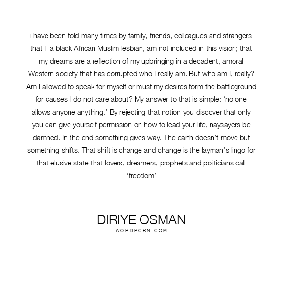 i have been told many times by family, friends, colleagues and strangers that I, a black African Muslim lesbian, am not included in this vision; that my dreams are a reflection of my upbringing in a decadent, amoral Western society that has corrupted who I really am. But who am I, really? Am I allowed to speak for myself or must my desires form the battleground for causes I do not care about? My answer to that is simple: ‘no one allows anyone anything.’ By rejecting that notion you discover that only you can give yourself permission on how to lead your life, naysayers be damned. In the end something gives way. The earth doesn’t move but something shifts. That shift is change and change is the layman’s lingo for that elusive state that lovers, dreamers, prophets and politicians call ‘freedom’