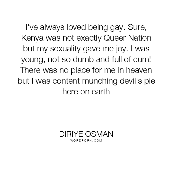 I've always loved being gay. Sure, Kenya was not exactly Queer Nation but my sexuality gave me joy. I was young, not so dumb and full of cum! There was no place for me in heaven but I was content munching devil's pie here on earth