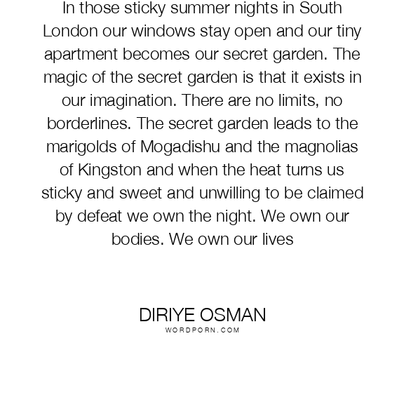 In those sticky summer nights in South London our windows stay open and our tiny apartment becomes our secret garden. The magic of the secret garden is that it exists in our imagination. There are no limits, no borderlines. The secret garden leads to the marigolds of Mogadishu and the magnolias of Kingston and when the heat turns us sticky and sweet and unwilling to be claimed by defeat we own the night. We own our bodies. We own our lives