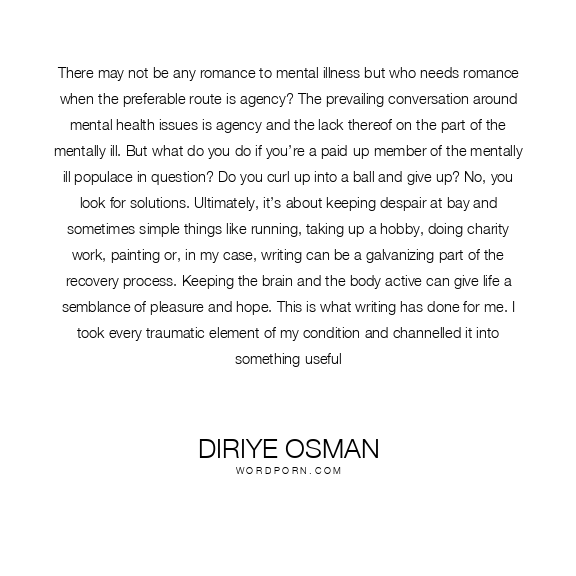 There may not be any romance to mental illness but who needs romance when the preferable route is agency? The prevailing conversation around mental health issues is agency and the lack thereof on the part of the mentally ill. But what do you do if you’re a paid-up member of the mentally ill populace in question? Do you curl up into a ball and give up? No, you look for solutions. Ultimately, it’s about keeping despair at bay and sometimes simple things like running, taking up a hobby, doing charity work, painting or, in my case, writing can be a galvanizing part of the recovery process. Keeping the brain and the body active can give life a semblance of pleasure and hope. This is what writing has done for me. I took every traumatic element of my condition and channelled it into something useful