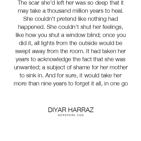 The scar she'd left her was so deep that it may take a thousand million years to heal. She couldn't pretend like nothing had happened. She couldn't shut her feelings, like how you shut a window blind; once you did it, all lights from the outside would be swept away from the room. It had taken her years to acknowledge the fact that she was unwanted; a subject of shame for her mother to sink in. And for sure, it would take her more than nine years to forget it all, in one go