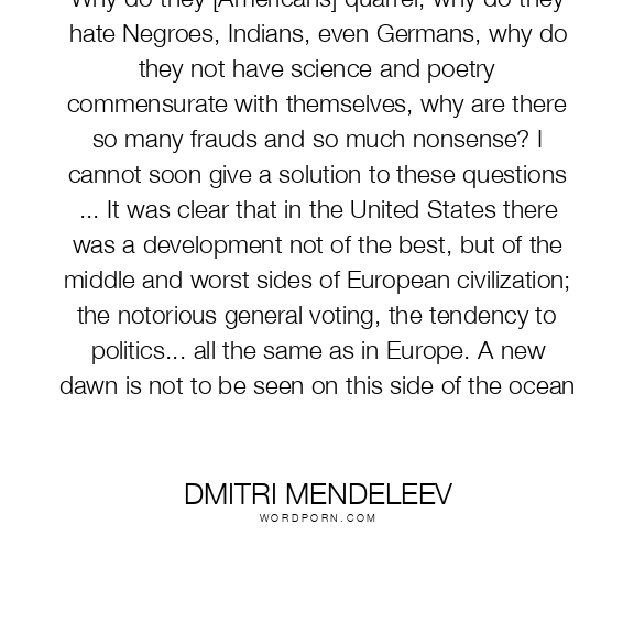 Why do they [Americans] quarrel, why do they hate Negroes, Indians, even Germans, why do they not have science and poetry commensurate with themselves, why are there so many frauds and so much nonsense? I cannot soon give a solution to these questions ... It was clear that in the United States there was a development not of the best, but of the middle and worst sides of European civilization; the notorious general voting, the tendency to politics... all the same as in Europe. A new dawn is not to be seen on this side of the ocean