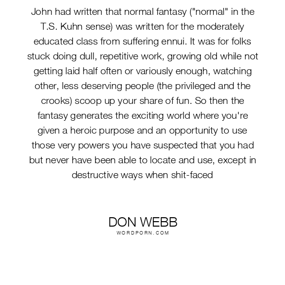 John had written that normal fantasy ("normal" in the T.S. Kuhn sense) was written for the moderately educated class suffering from ennui. It was for folks stuck doing dull, repetitive work, growing old while not getting laid half often or variously enough, watching other, less deserving people (the privileged and the crooks) scoop up your share of fun. So then the fantasy generates the exciting world where you're given a heroic purpose and an opportunity to use those very powers you have suspected that you had but never have been able to locate and use, except in destructive ways when shit-faced