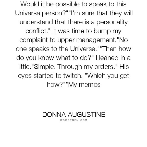Would it be possible to speak to this Universe person?""I'm sure that they will understand that there is a personality conflict." It was time to bump my complaint to upper management."No one speaks to the Universe.""Then how do you know what to do?" I leaned in a little."Simple. Through my orders." His eyes started to twitch. "Which you get how?""My memos