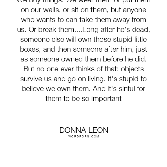 We buy things. We wear them or put them on our walls, or sit on them, but anyone who wants to can take them away from us. Or break them....Long after he's dead, someone else will own those stupid little boxes, and then someone after him, just as someone owned them before he did. But no one ever thinks of that: objects survive us and go on living. It's stupid to believe we own them. And it's sinful for them to be so important