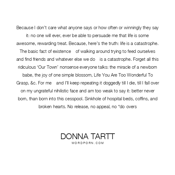 Because I don’t care what anyone says or how often or winningly they say it: no one will ever, ever be able to persuade me that life is some awesome, rewarding treat. Because, here’s the truth: life is a catastrophe. The basic fact of existence – of walking around trying to feed ourselves and find friends and whatever else we do – is a catastrophe. Forget all this ridiculous ‘Our Town’ nonsense everyone talks: the miracle of a newborn babe, the joy of one simple blossom, Life You Are Too Wonderful To Grasp, &c. For me – and I’ll keep repeating it doggedly till I die, till I fall over on my ungrateful nihilistic face and am too weak to say it: better never born, than born into this cesspool. Sinkhole of hospital beds, coffins, and broken hearts. No release, no appeal, no “do-overs