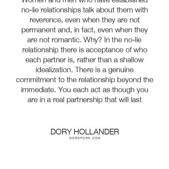 Women and men who have established no-lie relationships talk about them with reverence, even when they are not permanent and, in fact, even when they are not romantic. Why? In the no-lie relationship there is acceptance of who each partner is, rather than a shallow idealization. There is a genuine commitment to the relationship beyond the immediate. You each act as though you are in a real partnership that will last