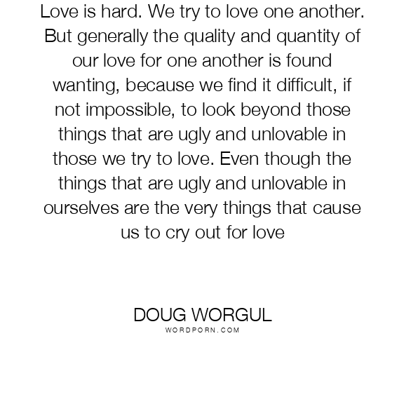 Love is hard. We try to love one another. But generally the quality and quantity of our love for one another is found wanting, because we find it difficult, if not impossible, to look beyond those things that are ugly and unlovable in those we try to love. Even though the things that are ugly and unlovable in ourselves are the very things that cause us to cry out for love