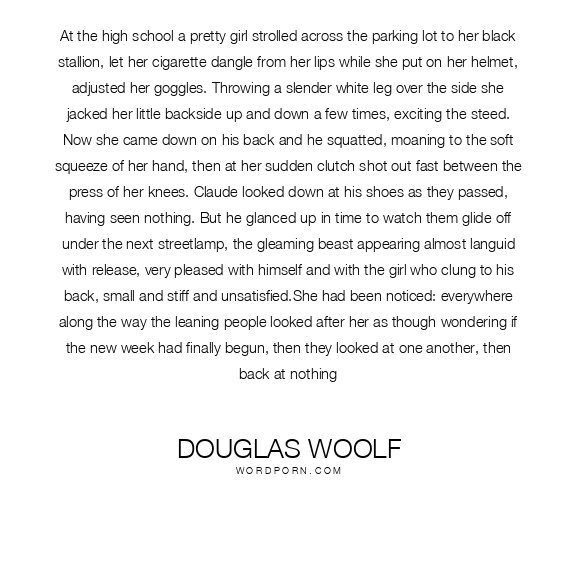 At the high school a pretty girl strolled across the parking lot to her black stallion, let her cigarette dangle from her lips while she put on her helmet, adjusted her goggles. Throwing a slender white leg over the side she jacked her little backside up and down a few times, exciting the steed. Now she came down on his back and he squatted, moaning to the soft squeeze of her hand, then at her sudden clutch shot out fast between the press of her knees. Claude looked down at his shoes as they passed, having seen nothing. But he glanced up in time to watch them glide off under the next streetlamp, the gleaming beast appearing almost languid with release, very pleased with himself and with the girl who clung to his back, small and stiff and unsatisfied.She had been noticed: everywhere along the way the leaning people looked after her as though wondering if the new week had finally begun, then they looked at one another, then back at nothing