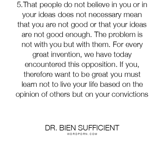 5.That people do not believe in you or in your ideas does not necessary mean that you are not good or that your ideas are not good enough. The problem is not with you but with them. For every great invention, we have today encountered this opposition. If you, therefore want to be great you must learn not to live your life based on the opinion of others but on your convictions