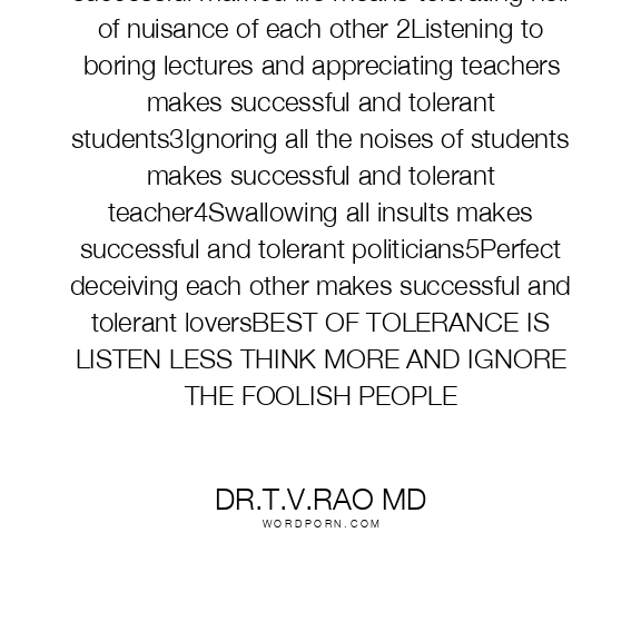 EXAMPLES OF TOLERANCE 1Long and successful married life means tolerating hell of nuisance of each other 2Listening to boring lectures and appreciating teachers makes successful and tolerant students3Ignoring all the noises of students makes successful and tolerant teacher4Swallowing all insults makes successful and tolerant politicians5Perfect deceiving each other makes successful and tolerant loversBEST OF TOLERANCE IS LISTEN LESS THINK MORE AND IGNORE THE FOOLISH PEOPLE