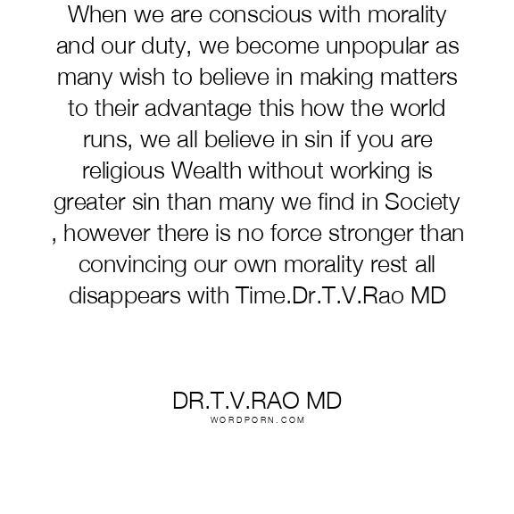 When we are conscious with morality and our duty, we become unpopular as many wish to believe in making matters to their advantage this how the world runs, we all believe in sin if you are religious Wealth without working is greater sin than many we find in Society , however there is no force stronger than convincing our own morality rest all disappears with Time.Dr.T.V.Rao MD