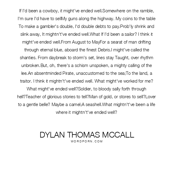 If I'd been a cowboy, it might've ended well.Somewhere on the ramble, I'm sure I'd have to sellMy guns along the highway. My coins to the table To make a gambler's double, I'd double debts to pay.Prob'ly shrink and slink away, It mightn't've ended well.What If I'd been a sailor? I think it might've ended well.From August to MayFor a searat of man drifting through eternal blue, aboard the finest Debris.I might've called the shanties. From daybreak to storm's set, lines stay Taught, over rhythm unbroken.But, oh, there's a schism unspoken, a mighty calling of the lee.An absentminded Pirate, unaccustomed to the sea;To the land, a traitor. I think it mightn't've ended well. What might've worked for me? What might've ended well?Soldier, to bloody sally forth through hell?Teacher of glorious stories to tell?Man of gold, or stores to sell?Lover to a gentle belle? Maybe a camel;A seashell.What mightn't've been a life where it mightn't've ended well?
