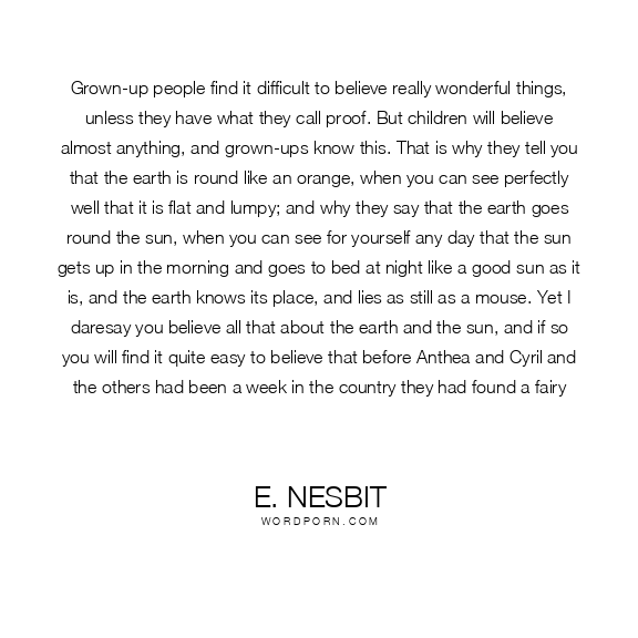Grown-up people find it difficult to believe really wonderful things, unless they have what they call proof. But children will believe almost anything, and grown-ups know this. That is why they tell you that the earth is round like an orange, when you can see perfectly well that it is flat and lumpy; and why they say that the earth goes round the sun, when you can see for yourself any day that the sun gets up in the morning and goes to bed at night like a good sun as it is, and the earth knows its place, and lies as still as a mouse. Yet I daresay you believe all that about the earth and the sun, and if so you will find it quite easy to believe that before Anthea and Cyril and the others had been a week in the country they had found a fairy