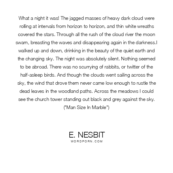 What a night it was! The jagged masses of heavy dark cloud were rolling at intervals from horizon to horizon, and thin white wreaths covered the stars. Through all the rush of the cloud river the moon swam, breasting the waves and disappearing again in the darkness.I walked up and down, drinking in the beauty of the quiet earth and the changing sky. The night was absolutely silent. Nothing seemed to be abroad. There was no scurrying of rabbits, or twitter of the half-asleep birds. And though the clouds went sailing across the sky, the wind that drove them never came low enough to rustle the dead leaves in the woodland paths. Across the meadows I could see the church tower standing out black and grey against the sky. ("Man Size In Marble")