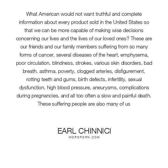 What American would not want truthful and complete information about every product sold in the United States so that we can be more capable of making wise decisions concerning our lives and the lives of our loved ones? These are our friends and our family members suffering from so many forms of cancer, several diseases of the heart, emphysema, poor circulation, blindness, strokes, various skin disorders, bad breath, asthma, poverty, clogged arteries, disfigurement, rotting teeth and gums, birth defects, infertility, sexual dysfunction, high blood pressure, aneurysms, complications during pregnancies, and all too often a slow and painful death. These suffering people are also many of us