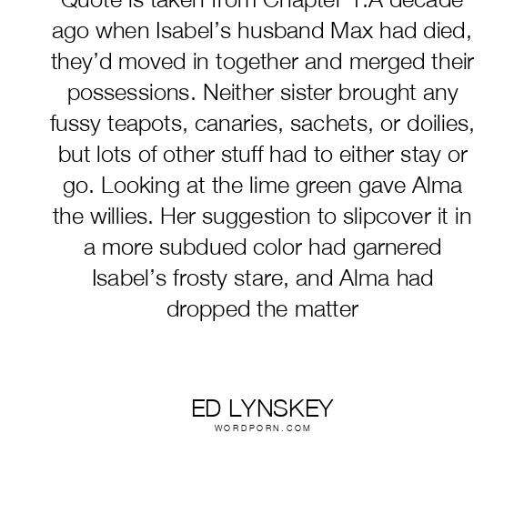 Quote is taken from Chapter 1:A decade ago when Isabel’s husband Max had died, they’d moved in together and merged their possessions. Neither sister brought any fussy teapots, canaries, sachets, or doilies, but lots of other stuff had to either stay or go. Looking at the lime green gave Alma the willies. Her suggestion to slipcover it in a more subdued color had garnered Isabel’s frosty stare, and Alma had dropped the matter