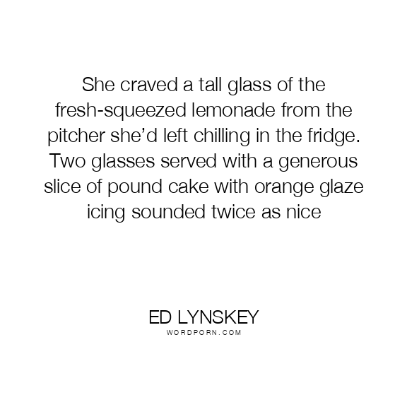 She craved a tall glass of the fresh-squeezed lemonade from the pitcher she’d left chilling in the fridge. Two glasses served with a generous slice of pound cake with orange glaze icing sounded twice as nice