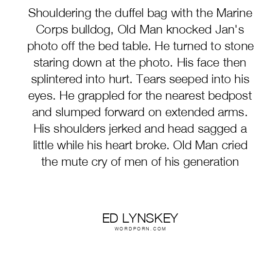 Shouldering the duffel bag with the Marine Corps bulldog, Old Man knocked Jan's photo off the bed table. He turned to stone staring down at the photo. His face then splintered into hurt. Tears seeped into his eyes. He grappled for the nearest bedpost and slumped forward on extended arms. His shoulders jerked and head sagged a little while his heart broke. Old Man cried the mute cry of men of his generation