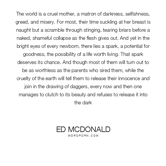 The world is a cruel mother, a matron of darkness, selfishness, greed, and misery. For most, their time suckling at her breast is naught but a scramble through stinging, tearing briars before a naked, shameful collapse as the flesh gives out. And yet in the bright eyes of every newborn, there lies a spark, a potential for goodness, the possibility of a life worth living. That spark deserves its chance. And though most of them will turn out to be as worthless as the parents who sired them, while the cruelty of the earth will tell them to release their innocence and join in the drawing of daggers, every now and then one manages to clutch to its beauty and refuses to release it into the dark