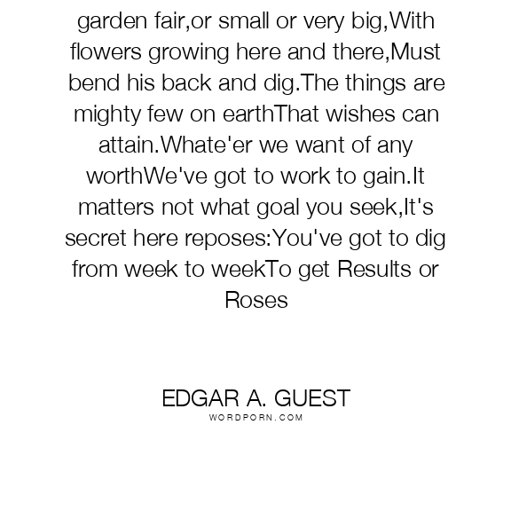 Results and RosesThe man who wants a garden fair,or small or very big,With flowers growing here and there,Must bend his back and dig.The things are mighty few on earthThat wishes can attain.Whate'er we want of any worthWe've got to work to gain.It matters not what goal you seek,It's secret here reposes:You've got to dig from week to weekTo get Results or Roses