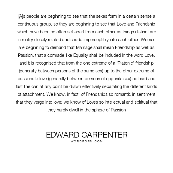 [A]s people are beginning to see that the sexes form in a certain sense a continuous group, so they are beginning to see that Love and Friendship which have been so often set apart from each other as things distinct are in reality closely related and shade imperceptibly into each other. Women are beginning to demand that Marriage shall mean Friendship as well as Passion; that a comrade-like Equality shall be included in the word Love; and it is recognised that from the one extreme of a 'Platonic' friendship (generally between persons of the same sex) up to the other extreme of passionate love (generally between persons of opposite sex) no hard and fast line can at any point be drawn effectively separating the different kinds of attachment. We know, in fact, of Friendships so romantic in sentiment that they verge into love; we know of Loves so intellectual and spiritual that they hardly dwell in the sphere of Passion