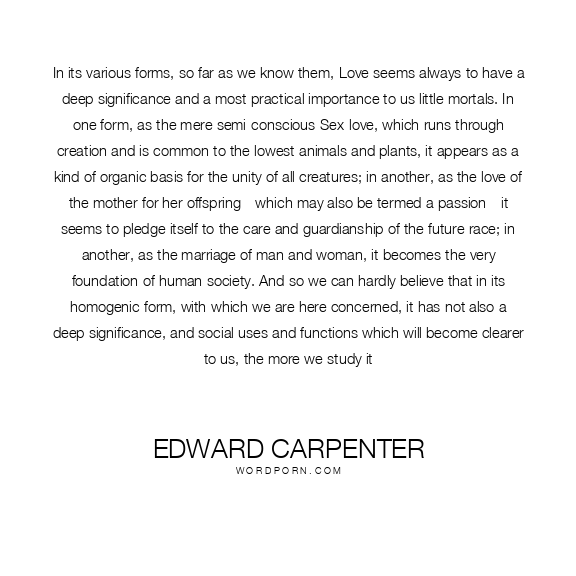 In its various forms, so far as we know them, Love seems always to have a deep significance and a most practical importance to us little mortals. In one form, as the mere semi-conscious Sex-love, which runs through creation and is common to the lowest animals and plants, it appears as a kind of organic basis for the unity of all creatures; in another, as the love of the mother for her offspring—which may also be termed a passion—it seems to pledge itself to the care and guardianship of the future race; in another, as the marriage of man and woman, it becomes the very foundation of human society. And so we can hardly believe that in its homogenic form, with which we are here concerned, it has not also a deep significance, and social uses and functions which will become clearer to us, the more we study it