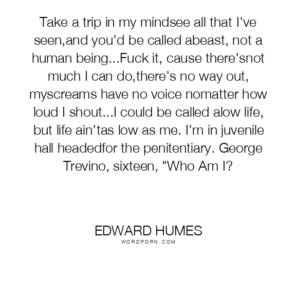 Take a trip in my mindsee all that I've seen,and you'd be called abeast, not a human being...Fuck it, cause there'snot much I can do,there's no way out, myscreams have no voice nomatter how loud I shout...I could be called alow life, but life ain'tas low as me. I'm in juvenile hall headedfor the penitentiary. George Trevino, sixteen, "Who Am I?