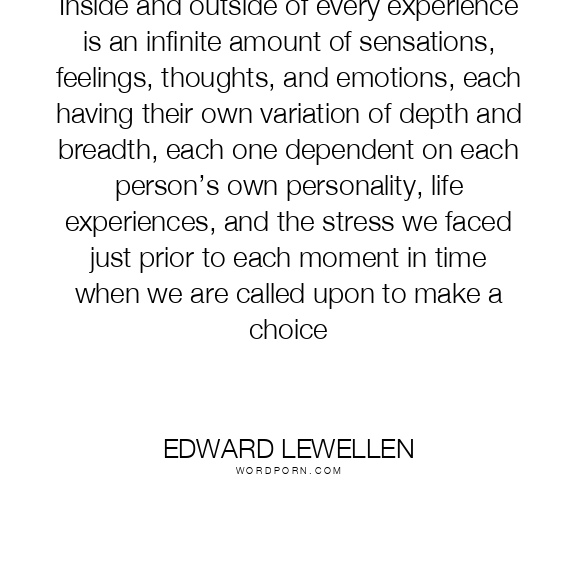 Inside and outside of every experience is an infinite amount of sensations, feelings, thoughts, and emotions, each having their own variation of depth and breadth, each one dependent on each person’s own personality, life experiences, and the stress we faced just prior to each moment in time when we are called upon to make a choice