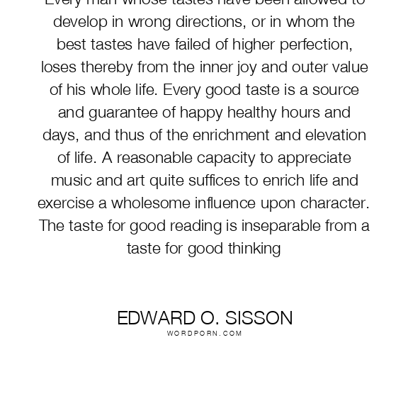 Every man whose tastes have been allowed to develop in wrong directions, or in whom the best tastes have failed of higher perfection, loses thereby from the inner joy and outer value of his whole life. Every good taste is a source and guarantee of happy healthy hours and days, and thus of the enrichment and elevation of life. A reasonable capacity to appreciate music and art quite suffices to enrich life and exercise a wholesome influence upon character. The taste for good reading is inseparable from a taste for good thinking