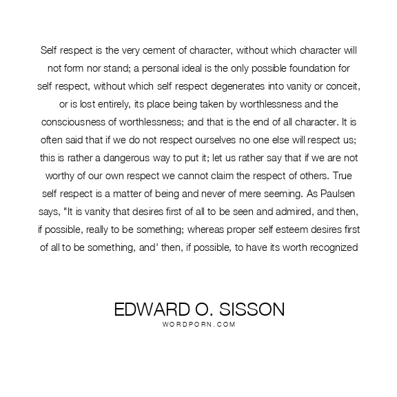 Self-respect is the very cement of character, without which character will not form nor stand; a personal ideal is the only possible foundation for self-respect, without which self-respect degenerates into vanity or conceit, or is lost entirely, its place being taken by worthlessness and the consciousness of worthlessness; and that is the end of all character. It is often said that if we do not respect ourselves no one else will respect us; this is rather a dangerous way to put it; let us rather say that if we are not worthy of our own respect we cannot claim the respect of others. True self-respect is a matter of being and never of mere seeming. As Paulsen says, "It is vanity that desires first of all to be seen and admired, and then, if possible, really to be something; whereas proper self esteem desires first of all to be something, and' then, if possible, to have its worth recognized