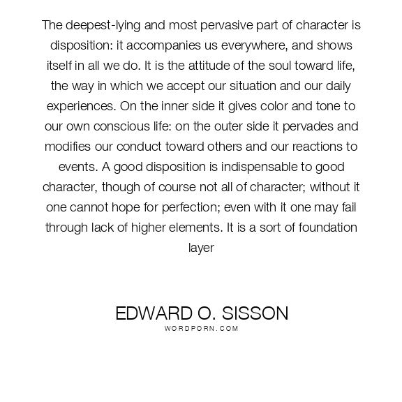 The deepest-lying and most pervasive part of character is disposition: it accompanies us everywhere, and shows itself in all we do. It is the attitude of the soul toward life, the way in which we accept our situation and our daily experiences. On the inner side it gives color and tone to our own conscious life: on the outer side it pervades and modifies our conduct toward others and our reactions to events. A good disposition is indispensable to good character, though of course not all of character; without it one cannot hope for perfection; even with it one may fail through lack of higher elements. It is a sort of foundation layer