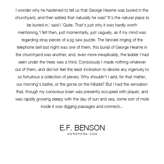 I wonder why he hastened to tell us that George Hearne was buried in the churchyard, and then added that naturally he was!''It's the natural place to be buried in,' said I.'Quite. That's just why it was hardly worth mentioning.'I felt then, just momentarily, just vaguely, as if my mind was regarding stray pieces of a jig-saw puzzle. The fancied ringing of the telephone bell last night was one of them, this burial of George Hearne in the churchyard was another, and, even more inexplicably, the ladder I had seen under the trees was a third. Consciously I made nothing whatever out of them, and did not feel the least inclination to devote any ingenuity to so fortuitous a collection of pieces. Why shouldn't I add, for that matter, our morning's bathe, or the gorse on the hillside? But I had the sensation that, though my conscious brain was presently occupied with piquet, and was rapidly growing sleepy with the day of sun and sea, some sort of mole inside it was digging passages and connecting corridors below the soil. ("Expiation")
