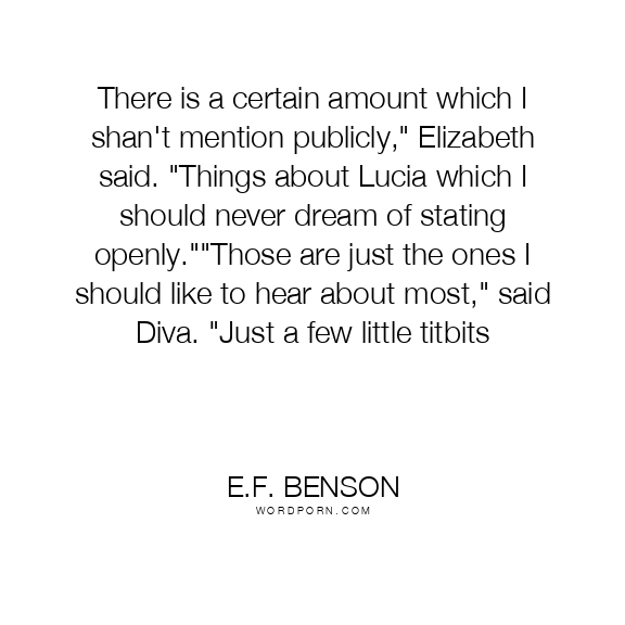 There is a certain amount which I shan't mention publicly," Elizabeth said. "Things about Lucia which I should never dream of stating openly.""Those are just the ones I should like to hear about most," said Diva. "Just a few little titbits