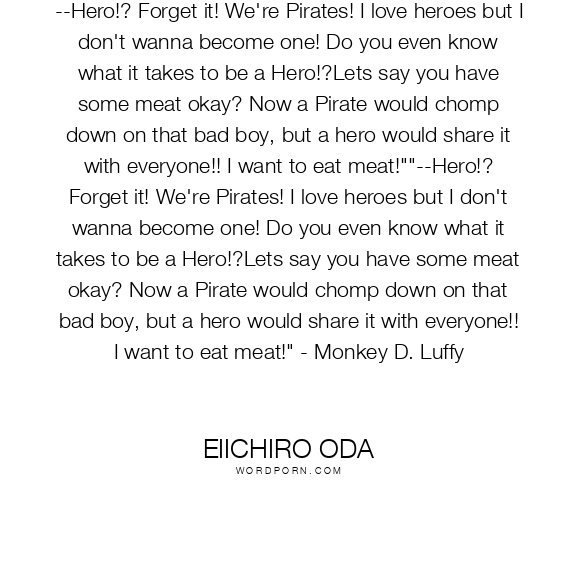 --Hero!? Forget it! We're Pirates! I love heroes but I don't wanna become one! Do you even know what it takes to be a Hero!?Lets say you have some meat okay? Now a Pirate would chomp down on that bad boy, but a hero would share it with everyone!! I want to eat meat!""--Hero!? Forget it! We're Pirates! I love heroes but I don't wanna become one! Do you even know what it takes to be a Hero!?Lets say you have some meat okay? Now a Pirate would chomp down on that bad boy, but a hero would share it with everyone!! I want to eat meat!" - Monkey D. Luffy