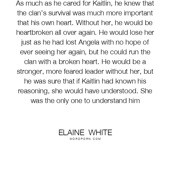As much as he cared for Kaitlin, he knew that the clan’s survival was much more important that his own heart. Without her, he would be heartbroken all over again. He would lose her just as he had lost Angela with no hope of ever seeing her again, but he could run the clan with a broken heart. He would be a stronger, more feared leader without her, but he was sure that if Kaitlin had known his reasoning, she would have understood. She was the only one to understand him