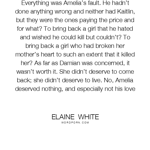 Everything was Amelia’s fault. He hadn’t done anything wrong and neither had Kaitlin, but they were the ones paying the price and for what? To bring back a girl that he hated and wished he could kill but couldn’t? To bring back a girl who had broken her mother’s heart to such an extent that it killed her? As far as Damian was concerned, it wasn’t worth it. She didn’t deserve to come back; she didn’t deserve to live. No, Amelia deserved nothing, and especially not his love