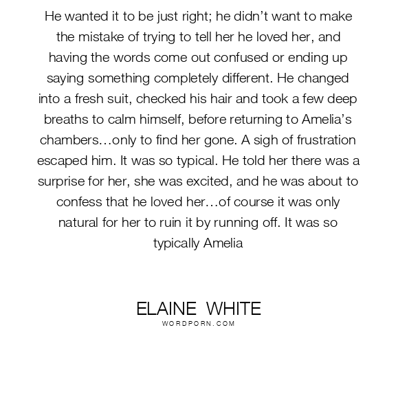 He wanted it to be just right; he didn’t want to make the mistake of trying to tell her he loved her, and having the words come out confused or ending up saying something completely different. He changed into a fresh suit, checked his hair and took a few deep breaths to calm himself, before returning to Amelia’s chambers…only to find her gone. A sigh of frustration escaped him. It was so typical. He told her there was a surprise for her, she was excited, and he was about to confess that he loved her…of course it was only natural for her to ruin it by running off. It was so typically Amelia