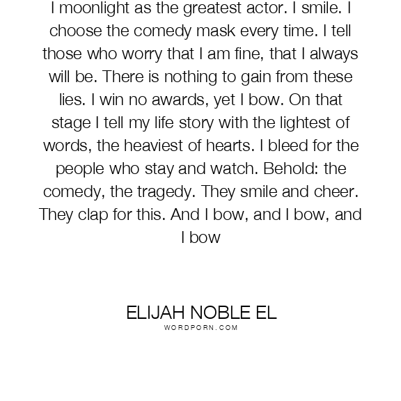 I moonlight as the greatest actor. I smile. I choose the comedy mask every time. I tell those who worry that I am fine, that I always will be. There is nothing to gain from these lies. I win no awards, yet I bow. On that stage I tell my life story with the lightest of words, the heaviest of hearts. I bleed for the people who stay and watch. Behold: the comedy, the tragedy. They smile and cheer. They clap for this. And I bow, and I bow, and I bow
