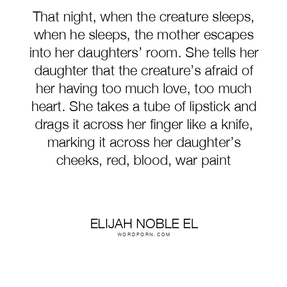 That night, when the creature sleeps, when he sleeps, the mother escapes into her daughters’ room. She tells her daughter that the creature’s afraid of her having too much love, too much heart. She takes a tube of lipstick and drags it across her finger like a knife, marking it across her daughter’s cheeks, red, blood, war paint