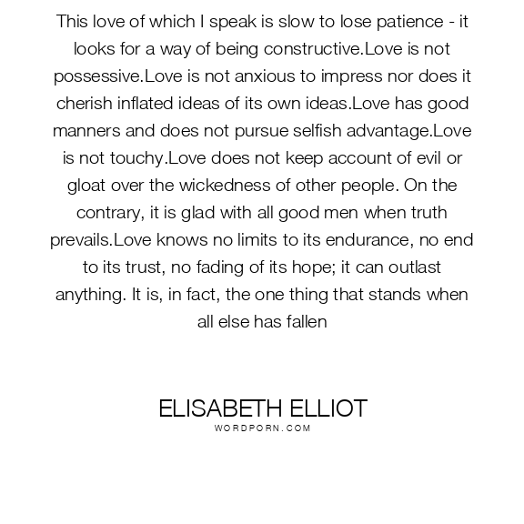 This love of which I speak is slow to lose patience - it looks for a way of being constructive.Love is not possessive.Love is not anxious to impress nor does it cherish inflated ideas of its own ideas.Love has good manners and does not pursue selfish advantage.Love is not touchy.Love does not keep account of evil or gloat over the wickedness of other people. On the contrary, it is glad with all good men when truth prevails.Love knows no limits to its endurance, no end to its trust, no fading of its hope; it can outlast anything. It is, in fact, the one thing that stands when all else has fallen