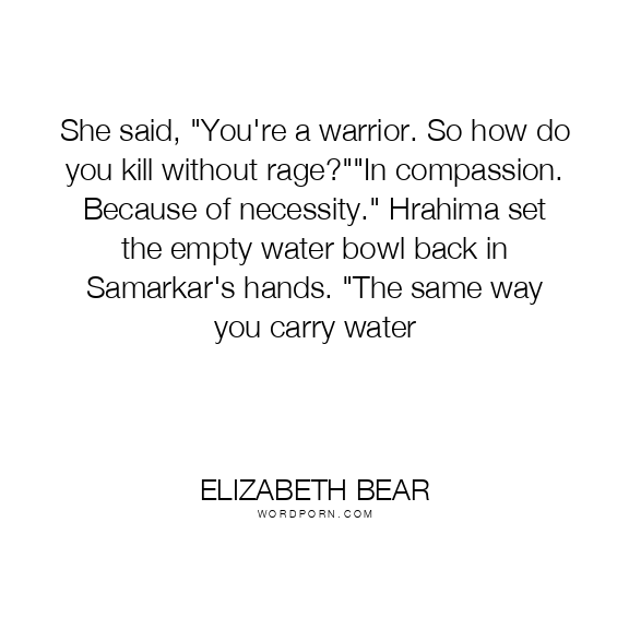 She said, "You're a warrior. So how do you kill without rage?""In compassion. Because of necessity." Hrahima set the empty water bowl back in Samarkar's hands. "The same way you carry water